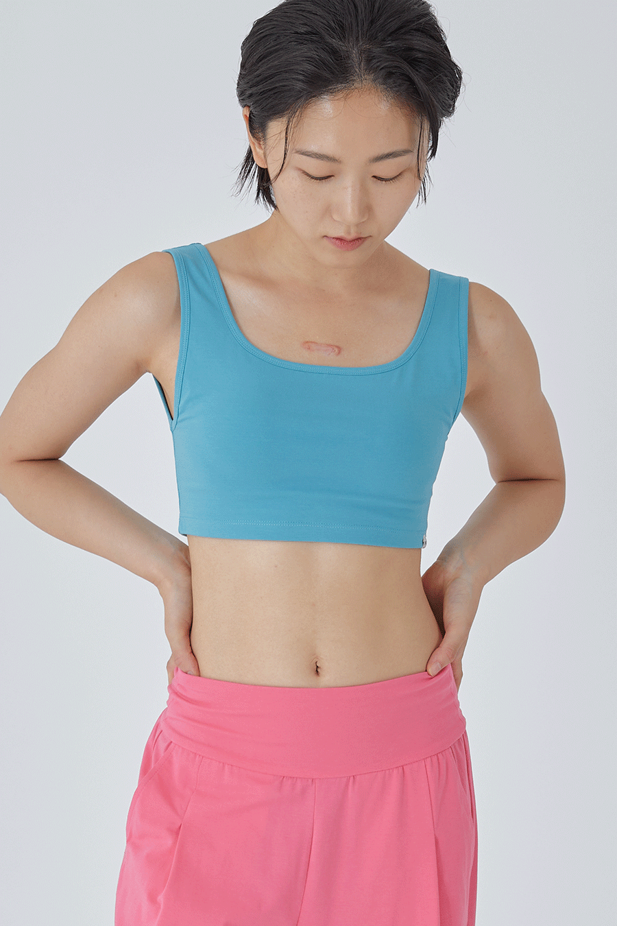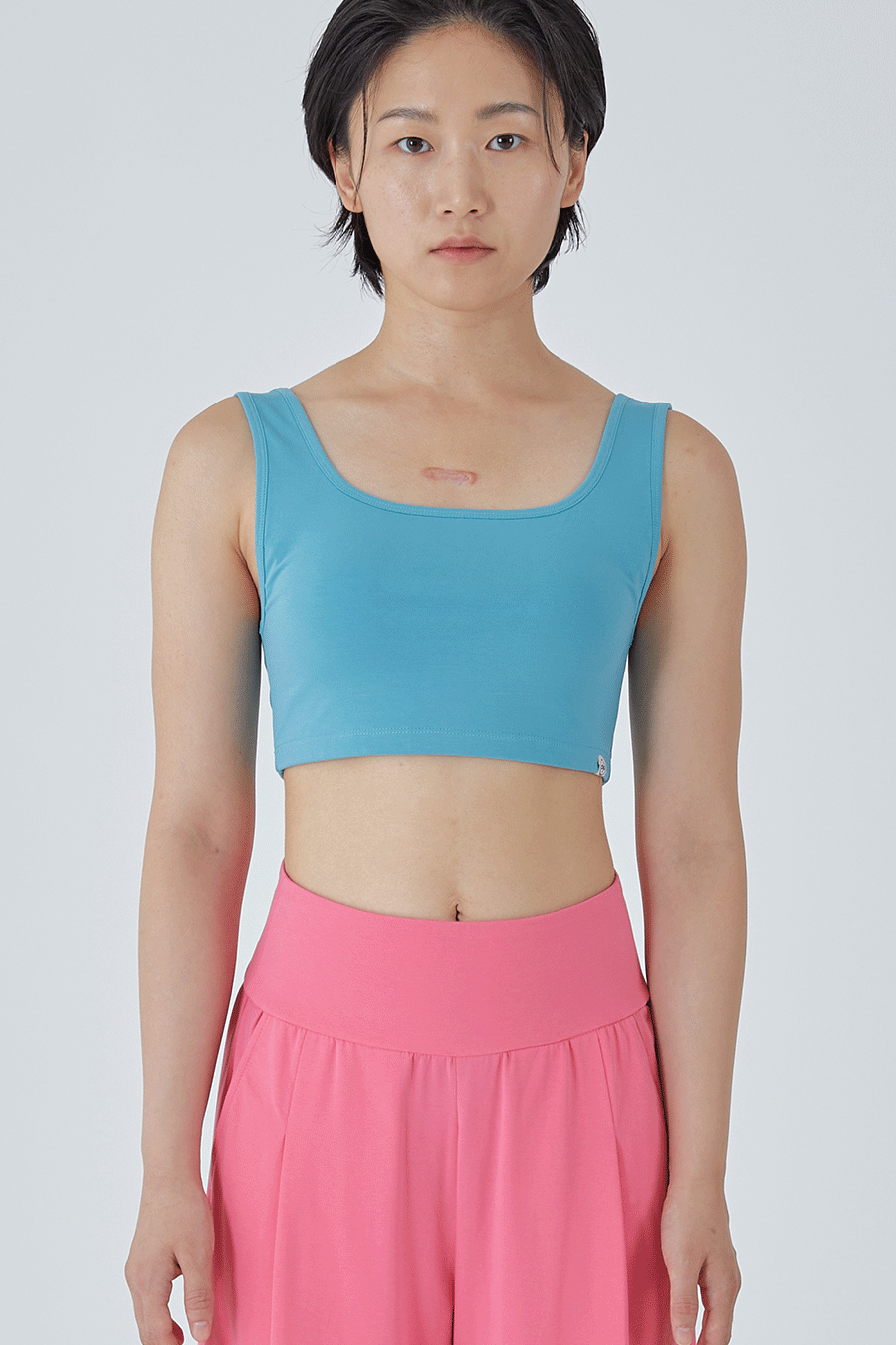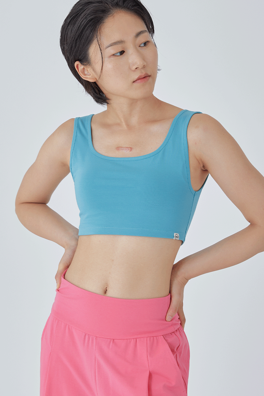 피부에 편안하며 신축성이 좋은 코튼+스판 혼방 원단으로 제작하였으며 , 밑 가슴부분은 엘라스틱 밴드가 삽입되지 않아 조이지 않는 편안함을 느낄 수 있습니다.
