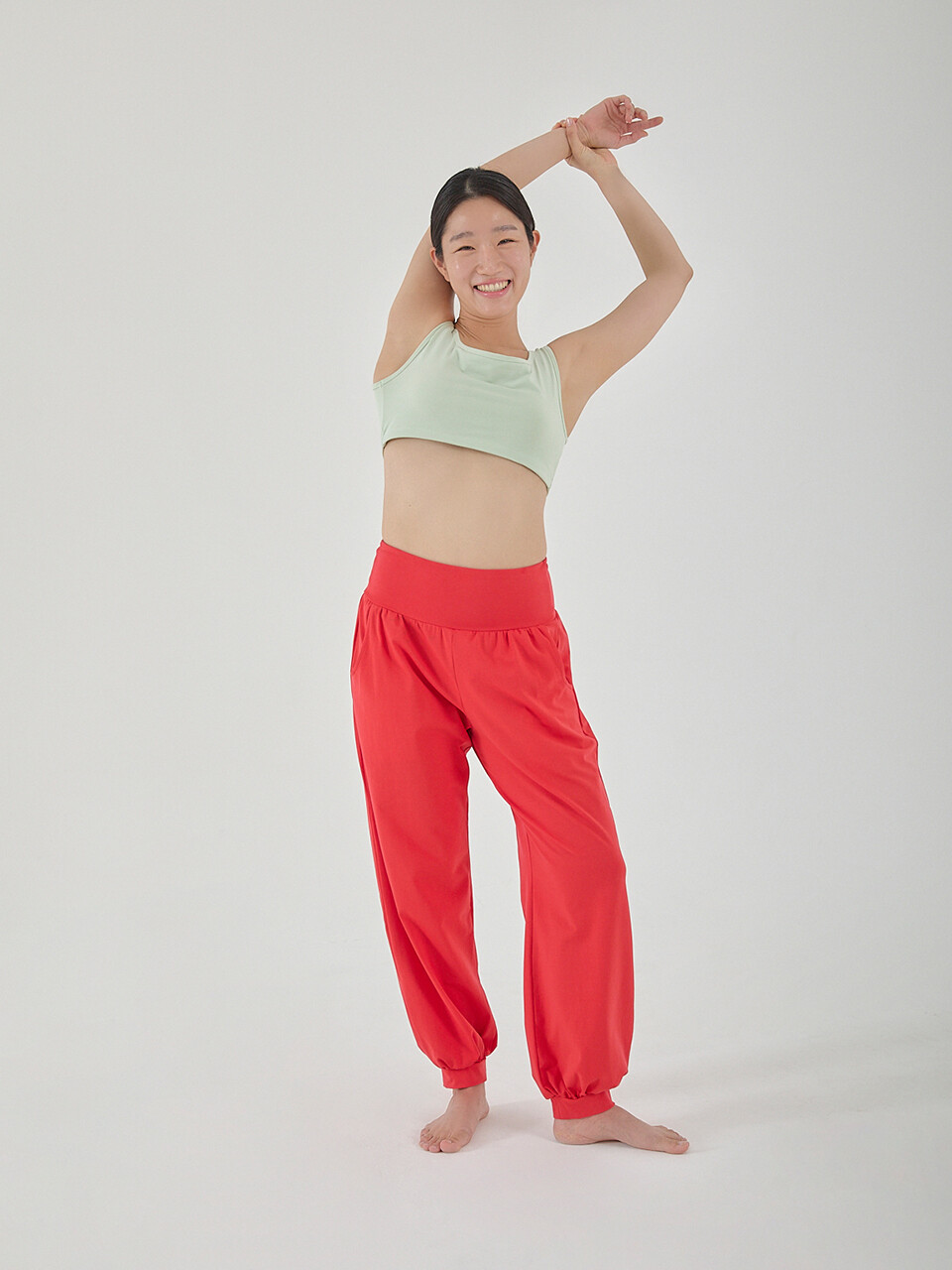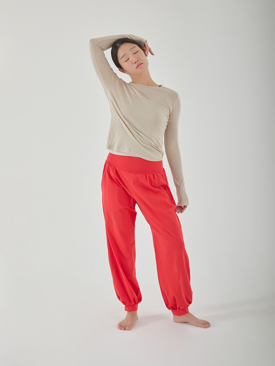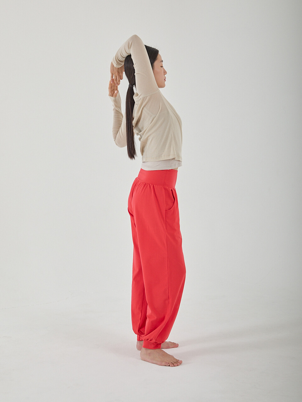 허리는 넓은 원단으로 복부를 편안히 감싸고, 가장 윗부분을 얇은 밴딩으로 마감해 착용 시 편안함에 내구성을 더했습니다. 발목은 제원단 시보리로 마감해 가볍고 압박이 없도록 디자인되었으며, 팬츠 옆선에는 넓은 주머니를 추가해 실용성을 높였습니다.