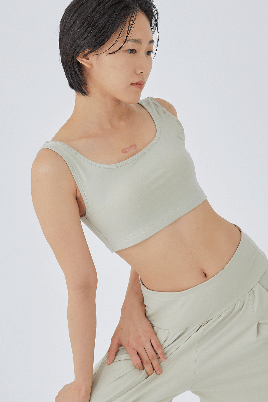 피부에 편안하며 신축성이 좋은 코튼+스판 혼방 원단으로 제작하였으며 , 밑 가슴부분은 엘라스틱 밴드가 삽입되지 않아 조이지 않는 편안함을 느낄 수 있습니다.
