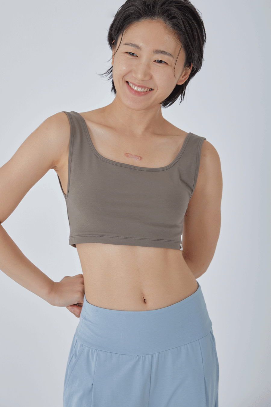 피부에 편안하며 신축성이 좋은 코튼+스판 혼방 원단으로 제작하였으며 , 밑 가슴부분은 엘라스틱 밴드가 삽입되지 않아 조이지 않는 편안함을 느낄 수 있습니다.