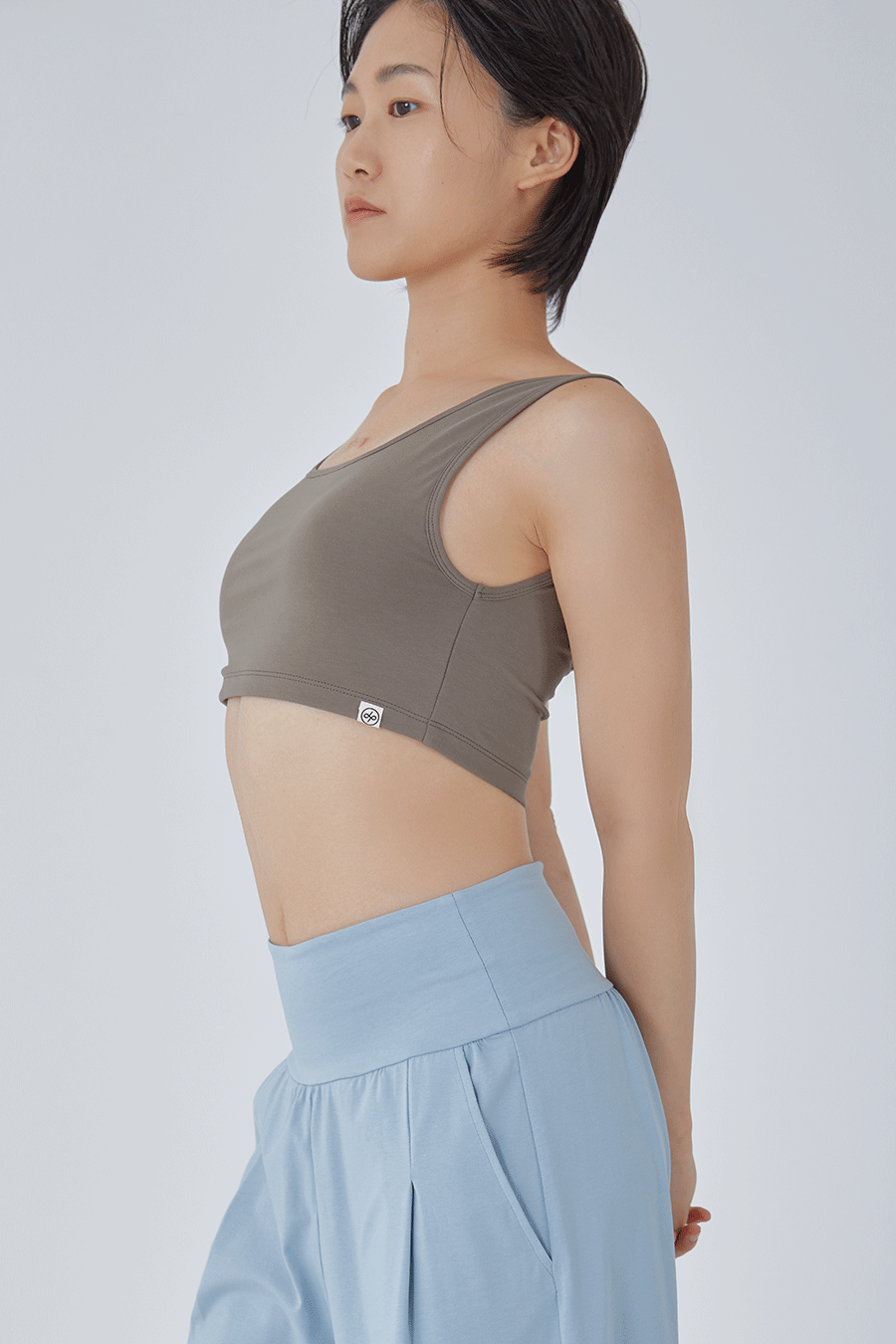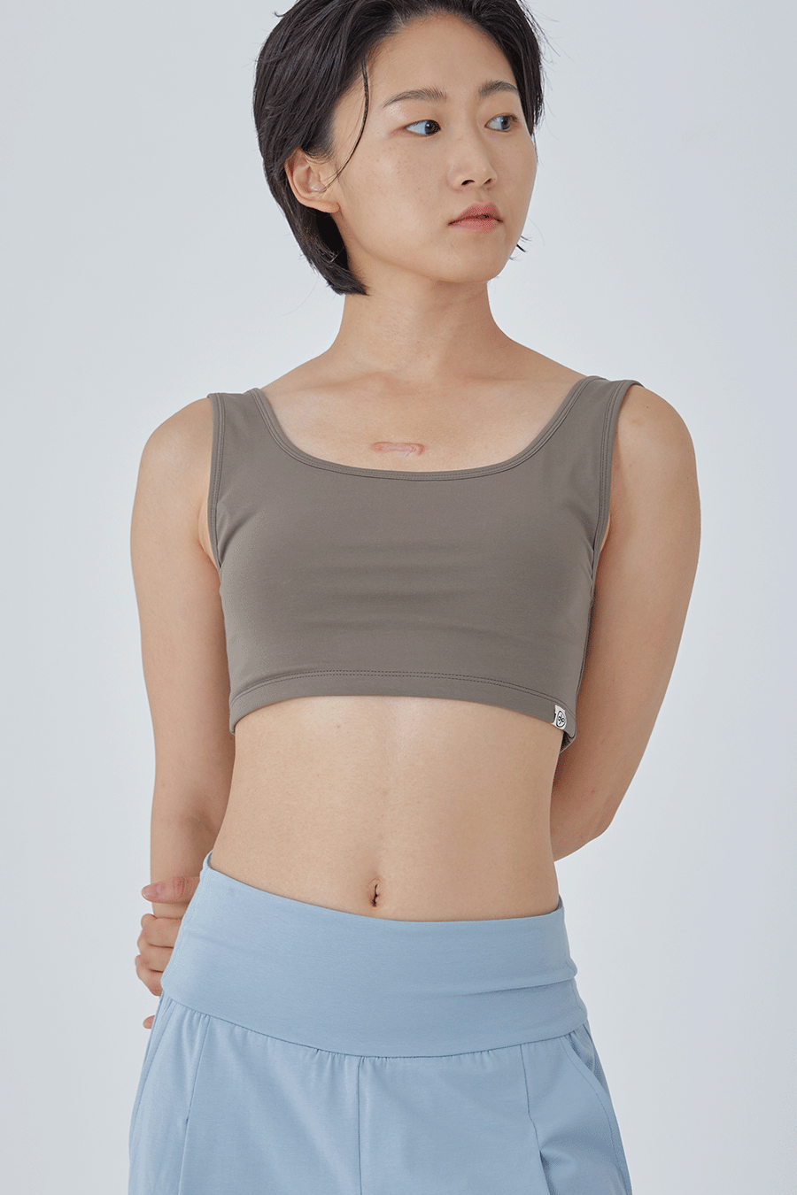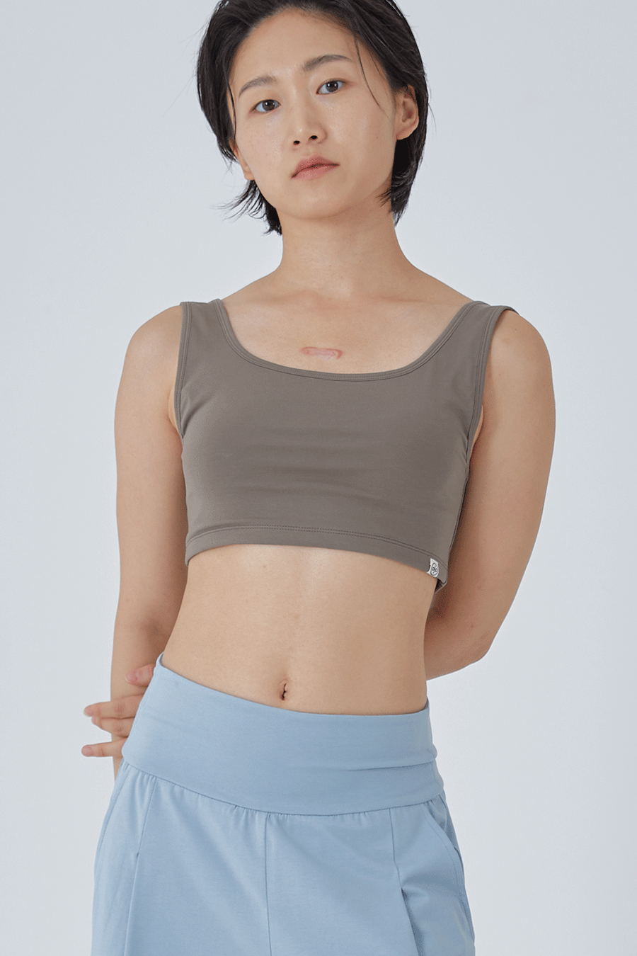 가슴 앞면은 2겹의 제원단, 1겹의 메쉬 원단으로 봉제되어 땀이 났을 때 빠르게 마를 수 있도록 통기성을 높였으며 브라 패드 탈부착이 가능합니다. 제품은 브라 패드가 포함되어 있습니다.