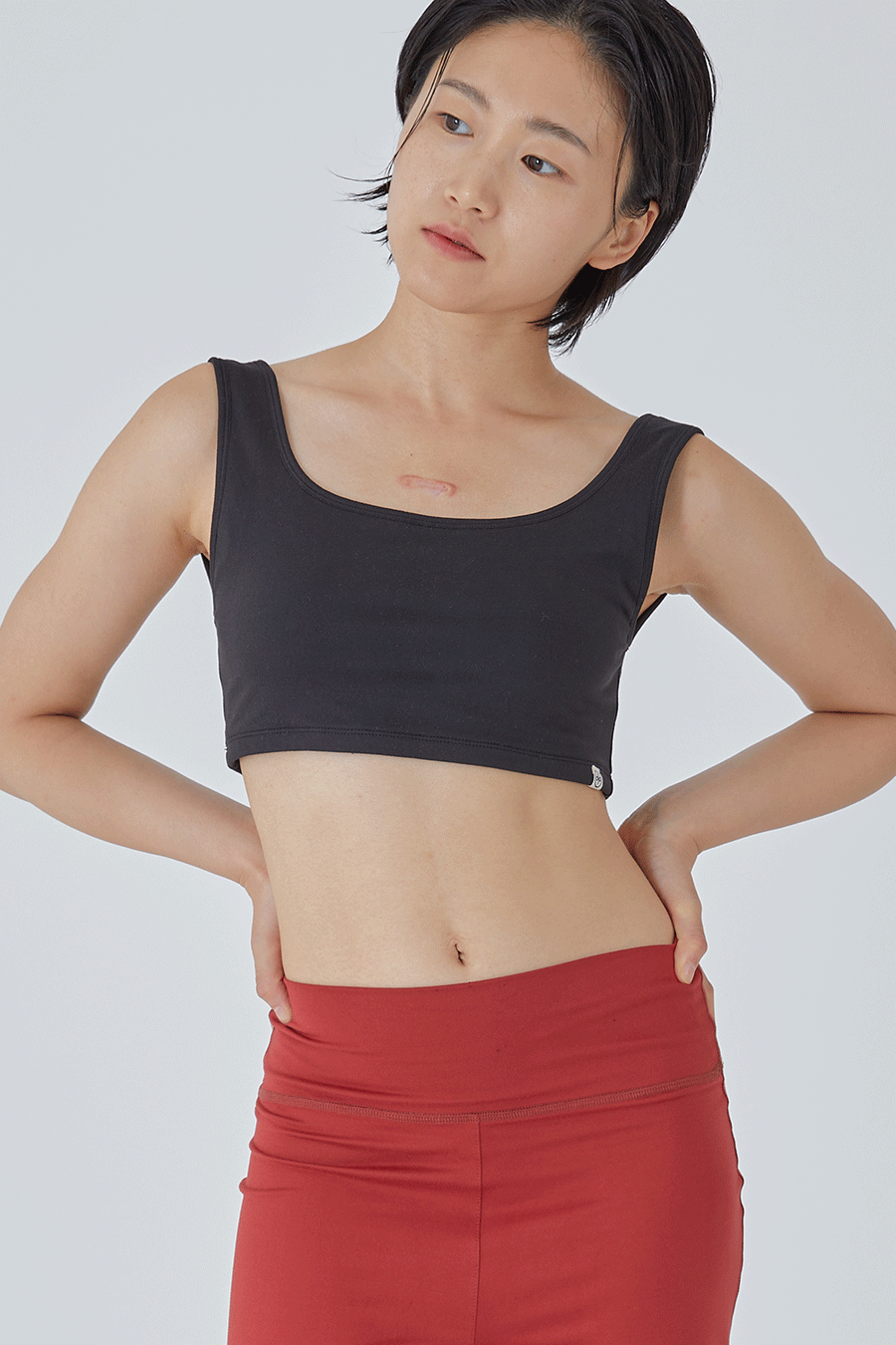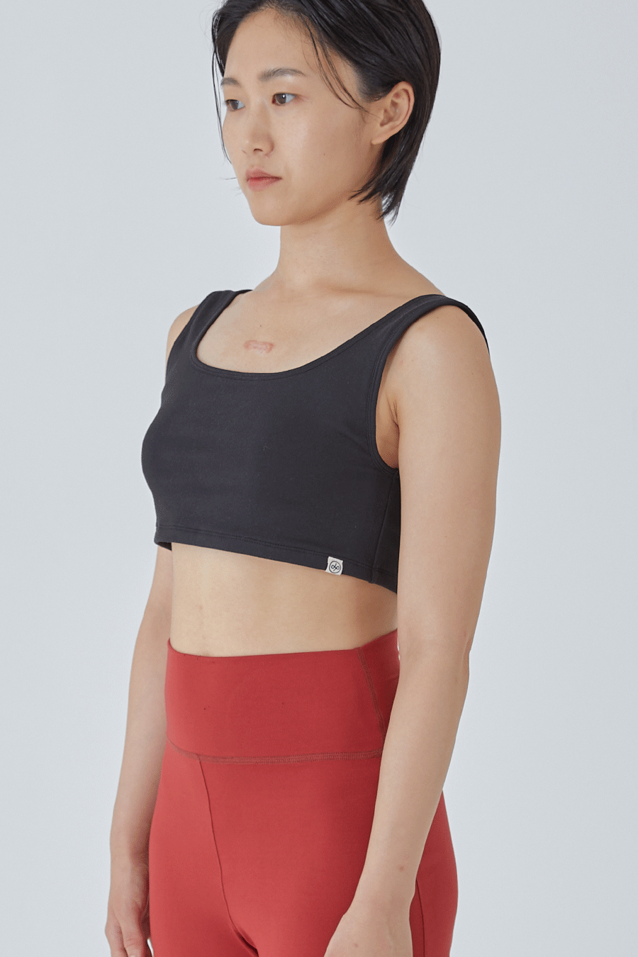 가슴 앞면은 2겹의 제원단, 1겹의 메쉬 원단으로 봉제되어 땀이 났을 때 빠르게 마를 수 있도록 통기성을 높였으며 브라 패드 탈부착이 가능합니다. 제품은 브라 패드가 포함되어 있습니다.